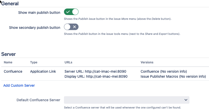 From the "Default Confluence Server" drop-down menu in the "Server" section, you can select the Confluence server you want to use as fallback whenever the one configured can't be found.