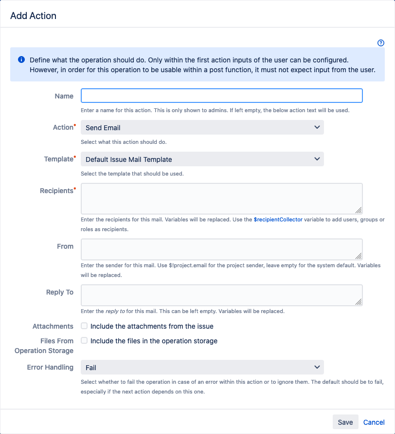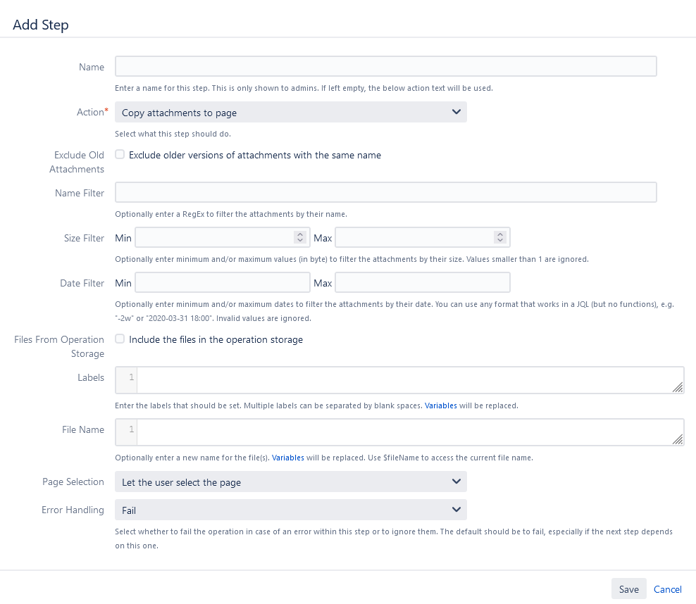 Labels: Optionally enter labels that should be set on the attachments. Multiple labels can be separated by blank spaces. Variables will be replaced.