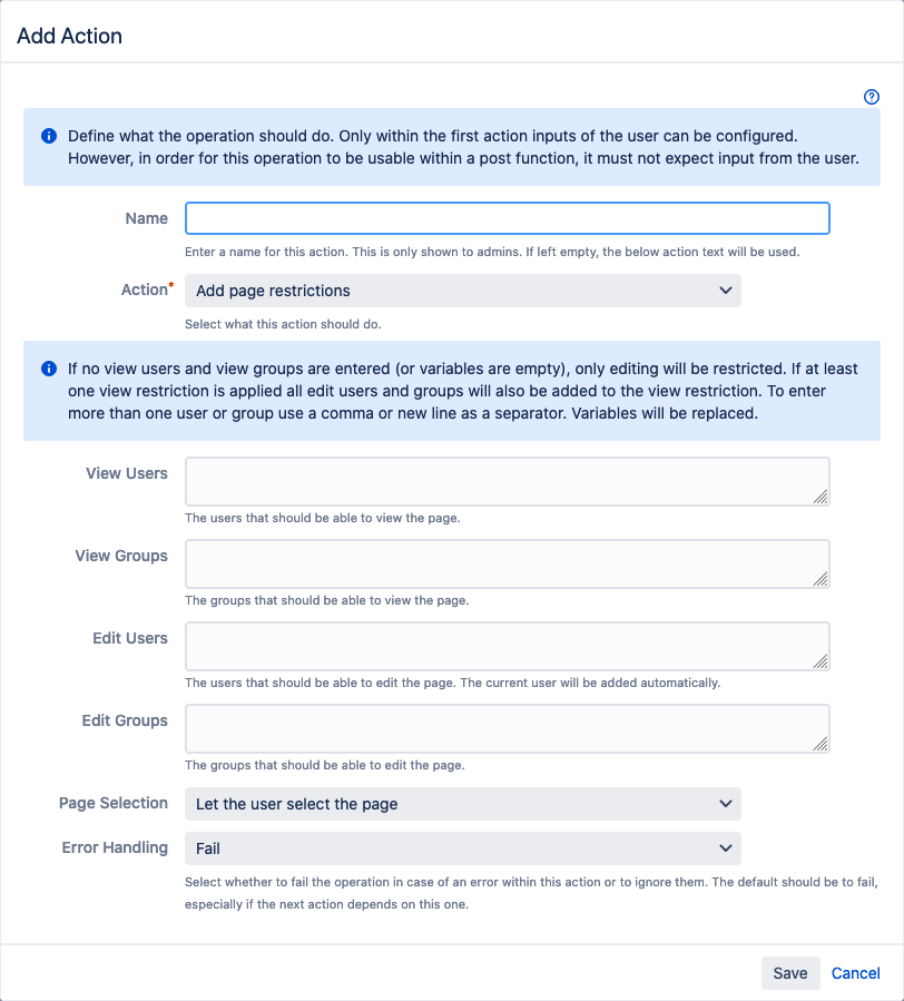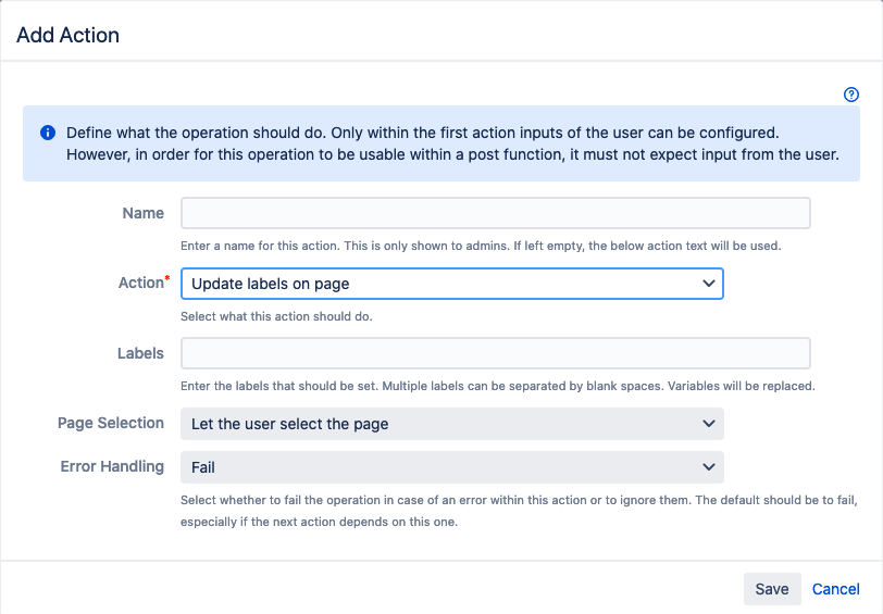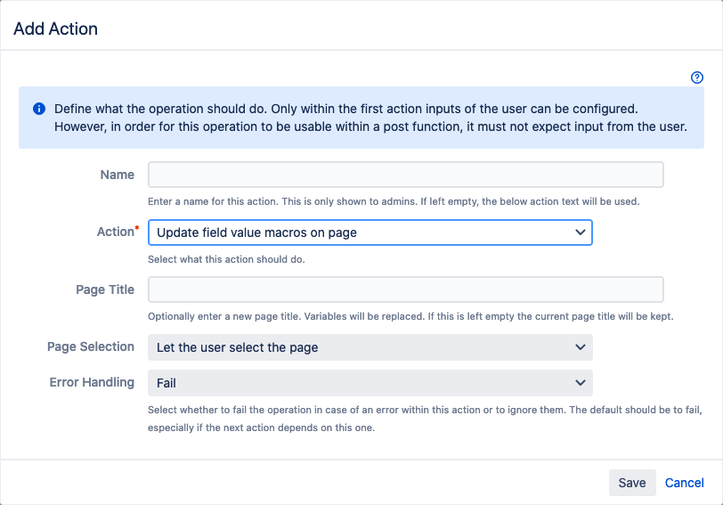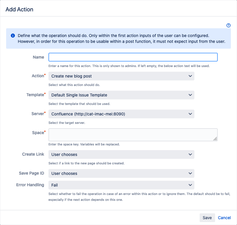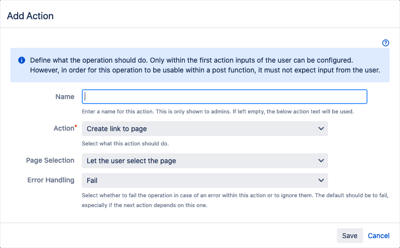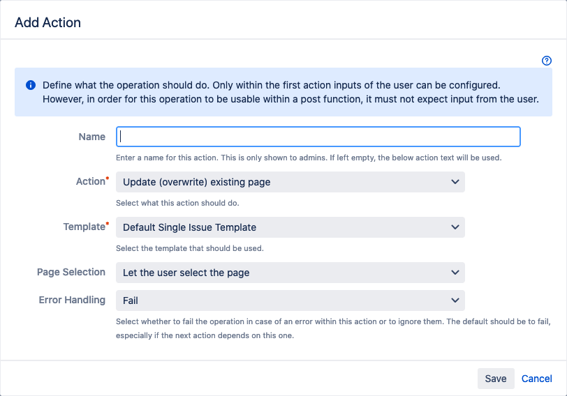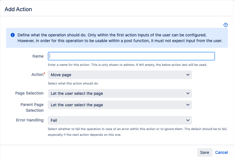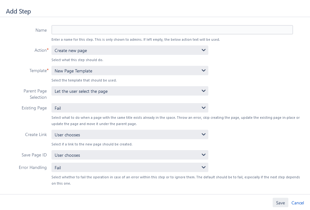 - Existing Page: Select what to do when a page with the same title exists already in the space. Possible options are throwing an error (Fail), skipping creating the page (Skip), updating the existing page in-place (Update in-place) or updating the page and moving it under the selected parent page (Update and move).