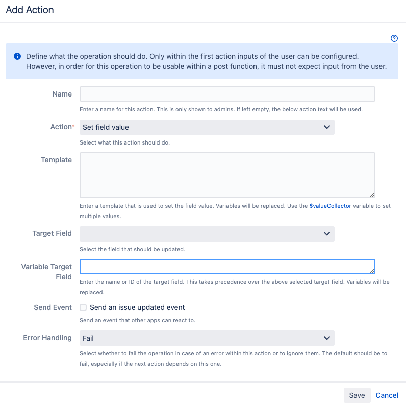 - Template: Enter a template that is used to set the field value. Variables will be replaced.