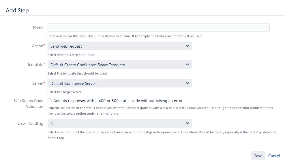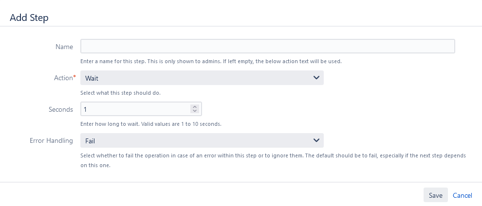 - Name: Enter a name for this step. This is only shown in the administration dialogs.