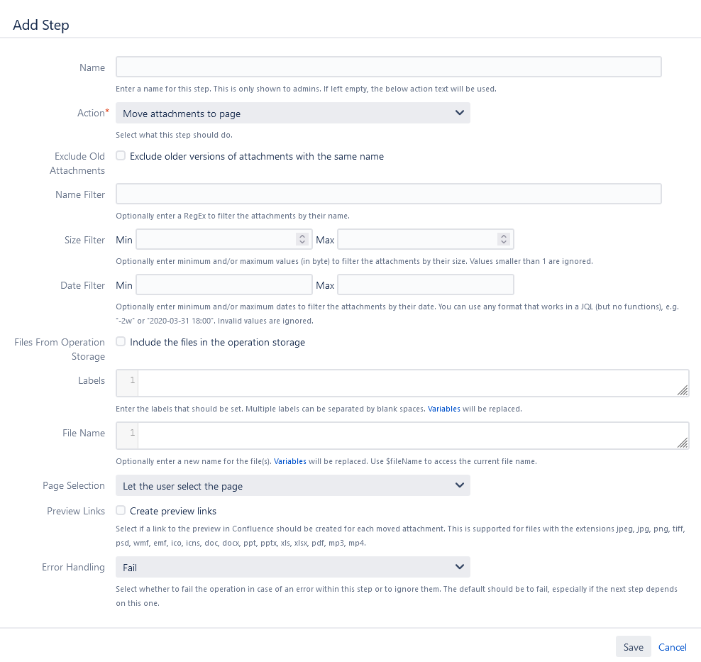 Files From Operation Store: Select this option to move files from the operation storage to a Confluence page. The files are removed from the operation store.