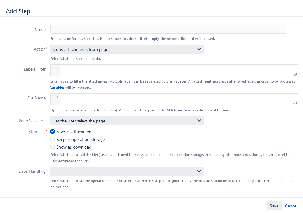 Copies attachments of a Confluence page to the current Jira issue or the operation store.