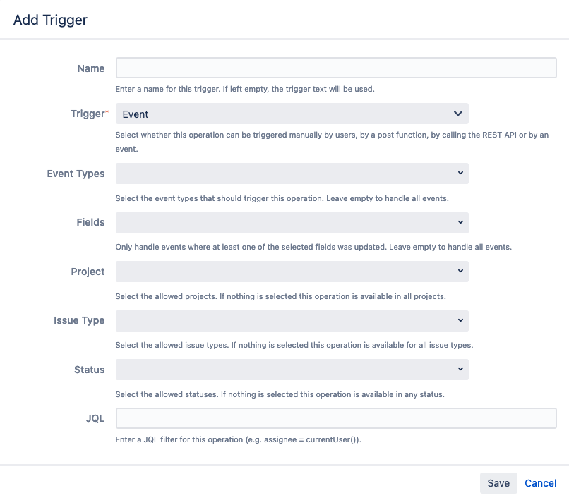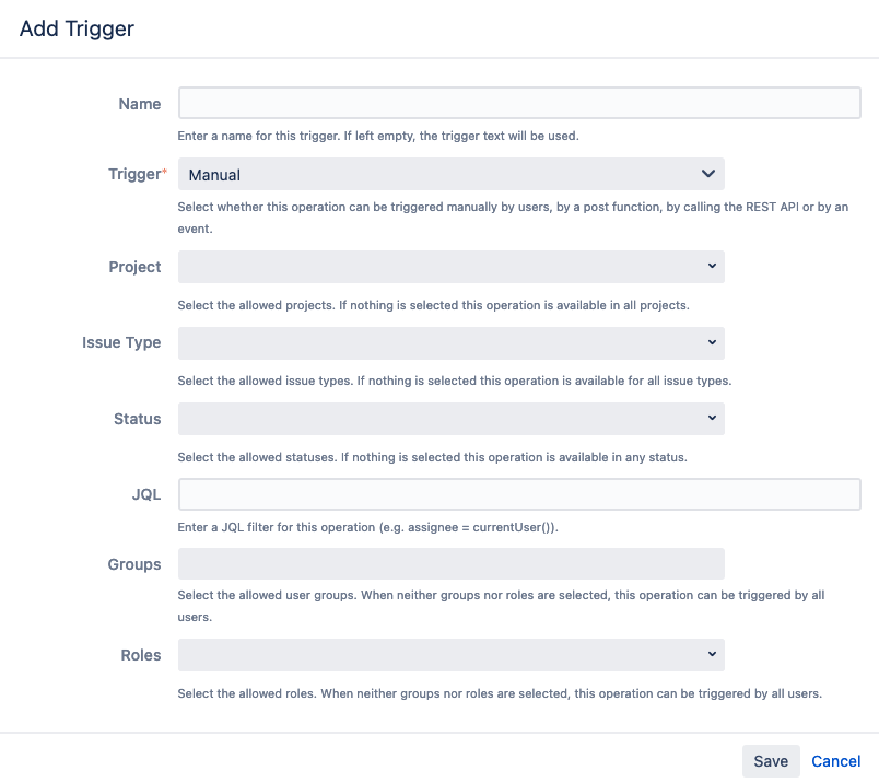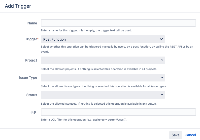 JQL: Enter a JQL filter for this operation (e.g. assignee = currentUser()). Only if the current issue matches the filter, the operation can be selected.