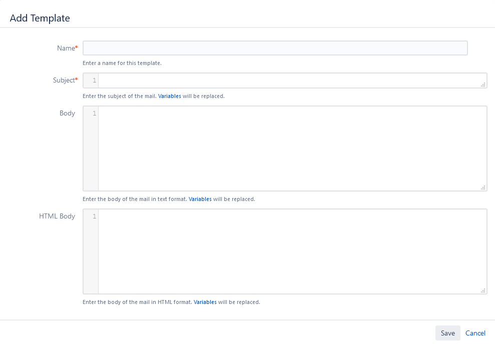 Click Add Template in the "Mail Templates" section of the "Manage Tempates" dialog. The "Add Template" dialog for a email template looks like the following: