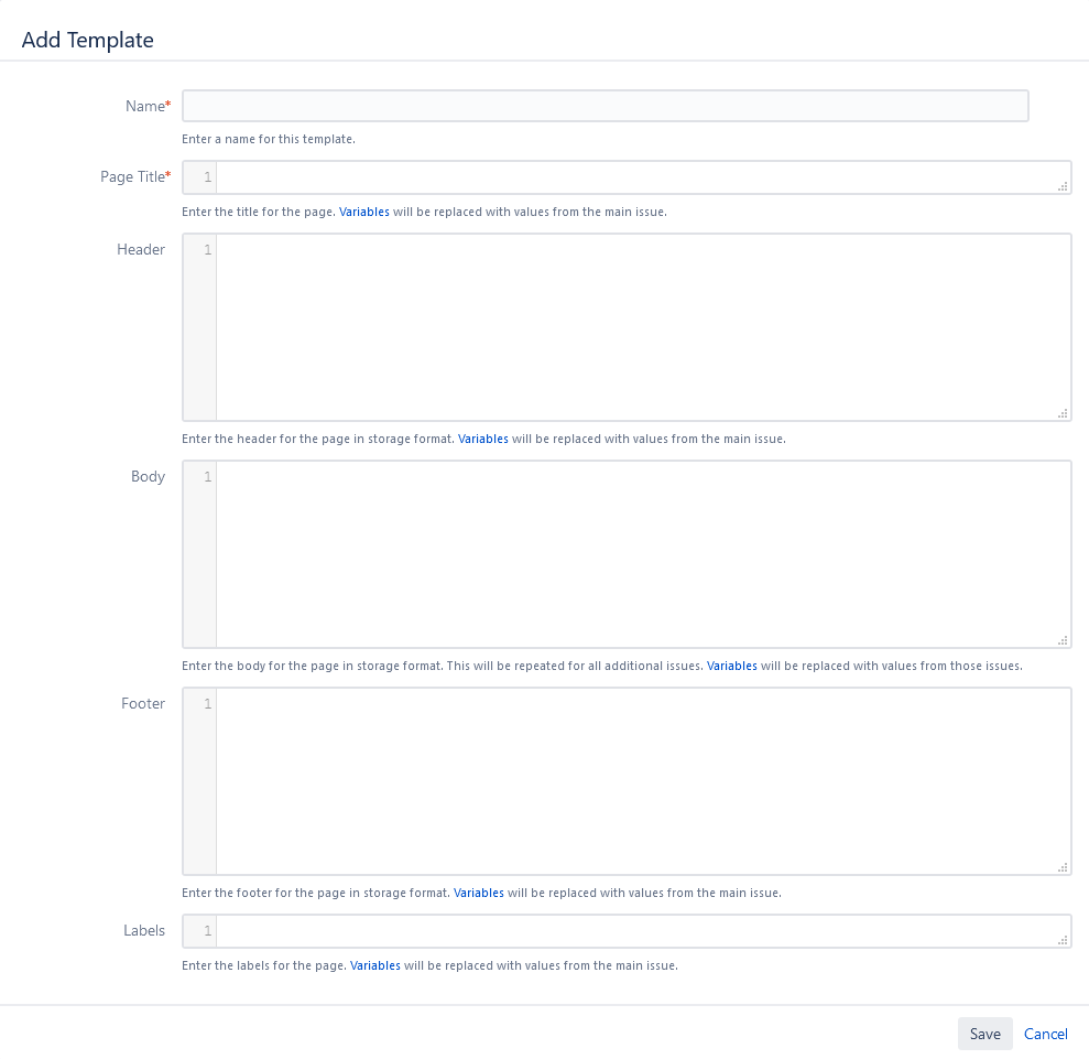- Footer: The footer for the page in storage format. Variables will be replaced with values from the main issue.