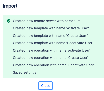 - Once the Import has finished, a confirmation message is displayed showing all the items which have been imported successfully. Click Close to return to the Import and Export menu.