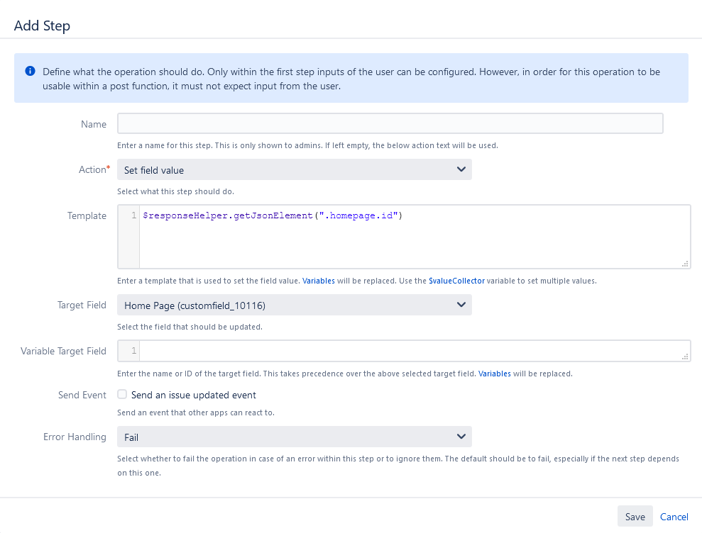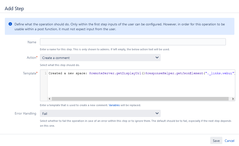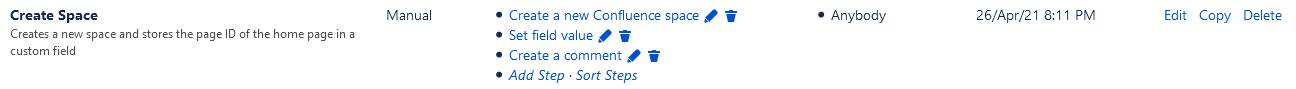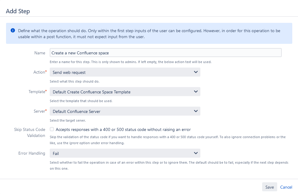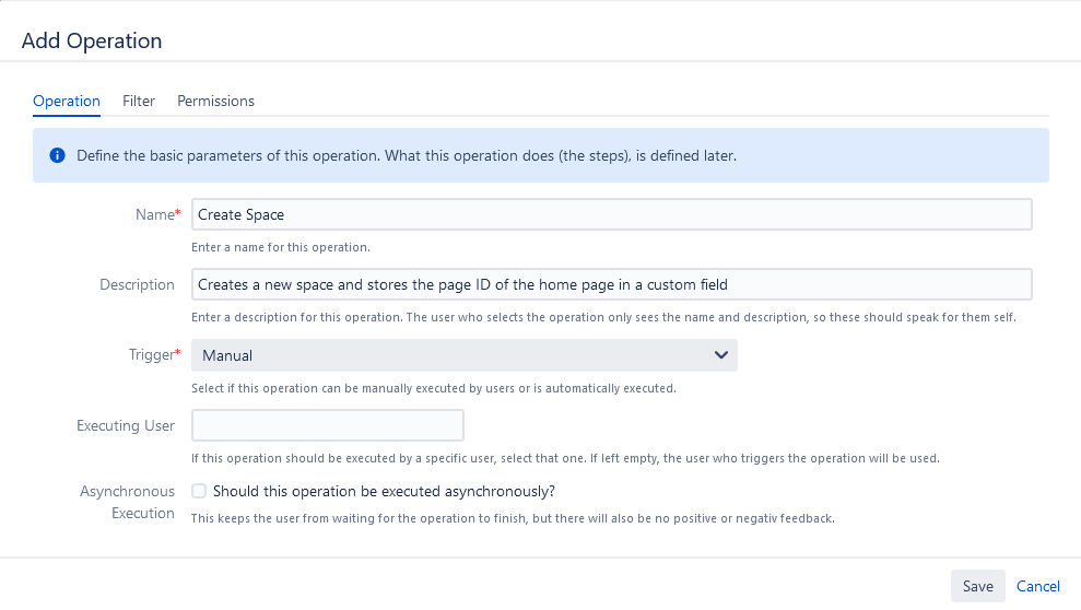 Here we will show you how to create an operation that lets your users create a new space. The operation will also store the page ID of the new spaces home page in a custom field and create a comment to inform the user about the new space. This example requires version 9.3.0 of the Issue Publisher or later.