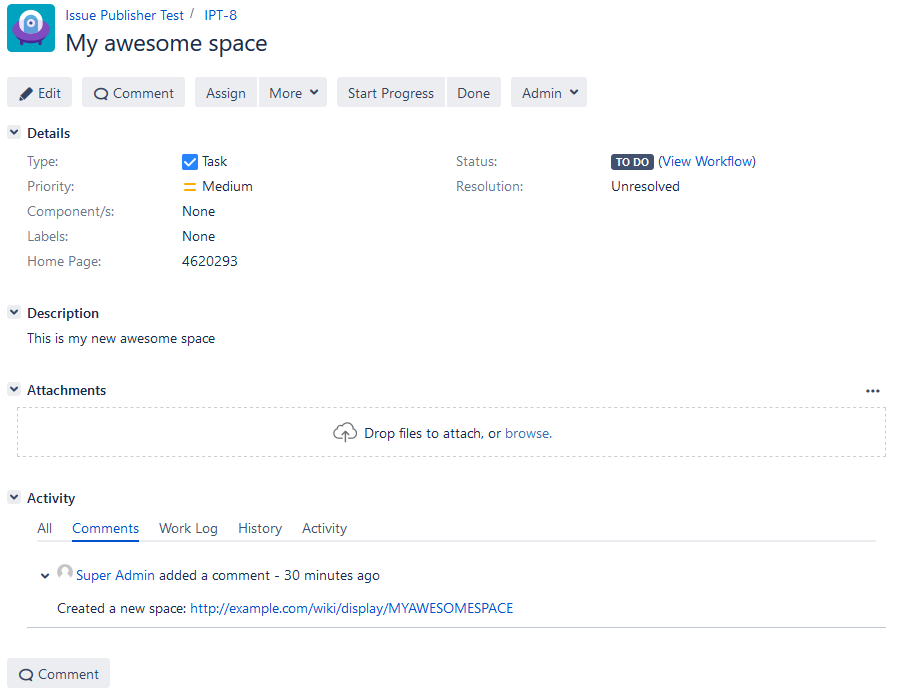 After executing the operation you can see the stored page ID and the new comment with the link to the new space on the issue.