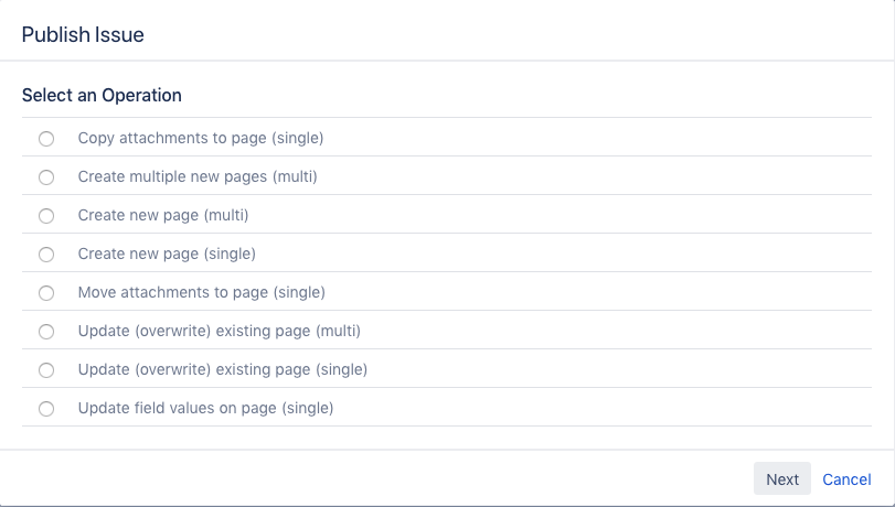 Teamworkx Issue Publisher for Jira distinguishes between operations (and actions) for one issue and multiple issues: