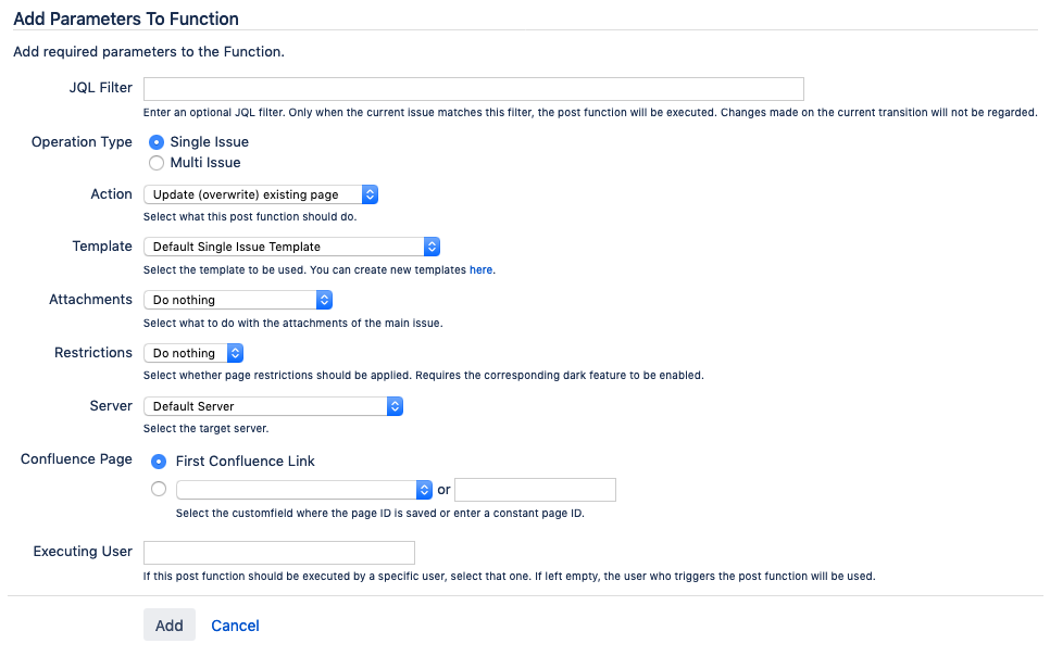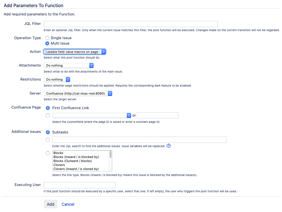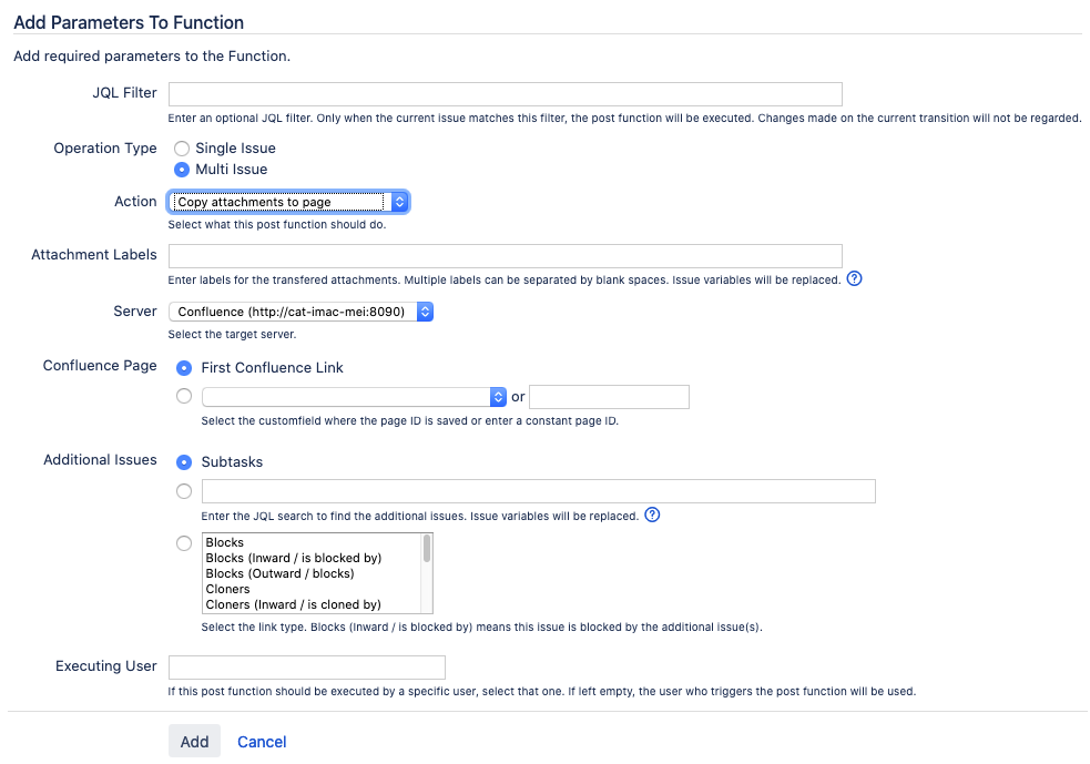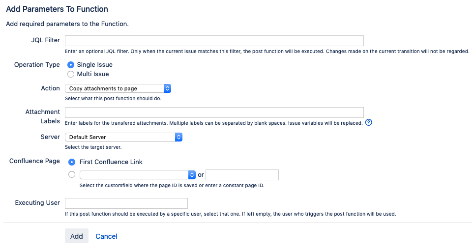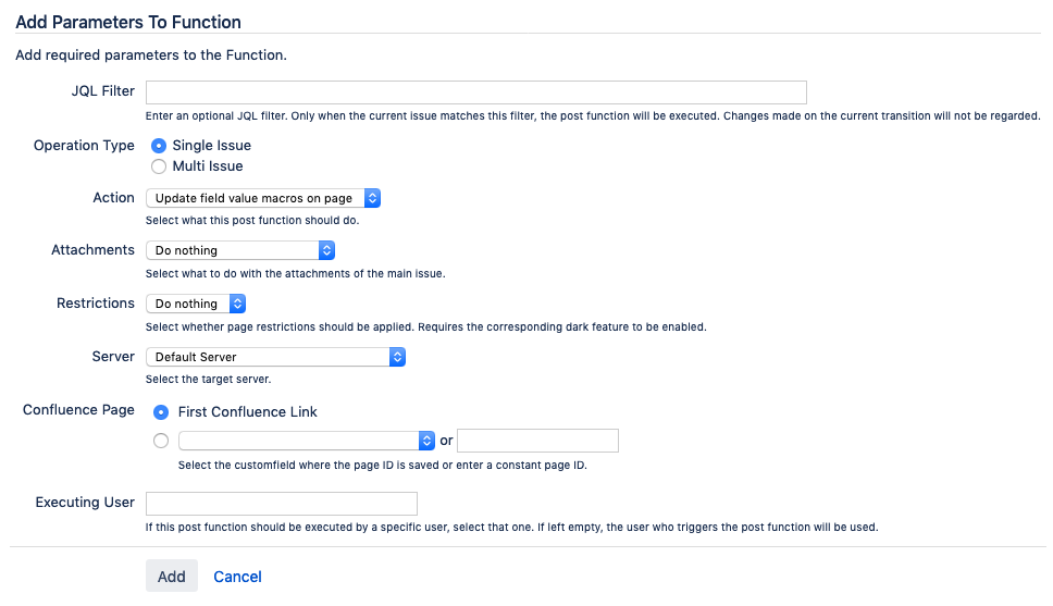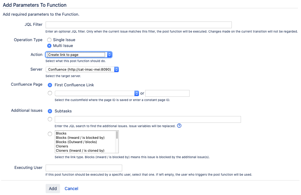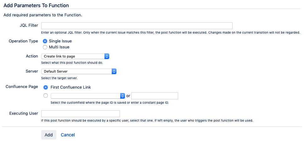 - JQL Filter: Enter a JQL statement. Only if the current issue matches this filter, the post function will be executed (optional).