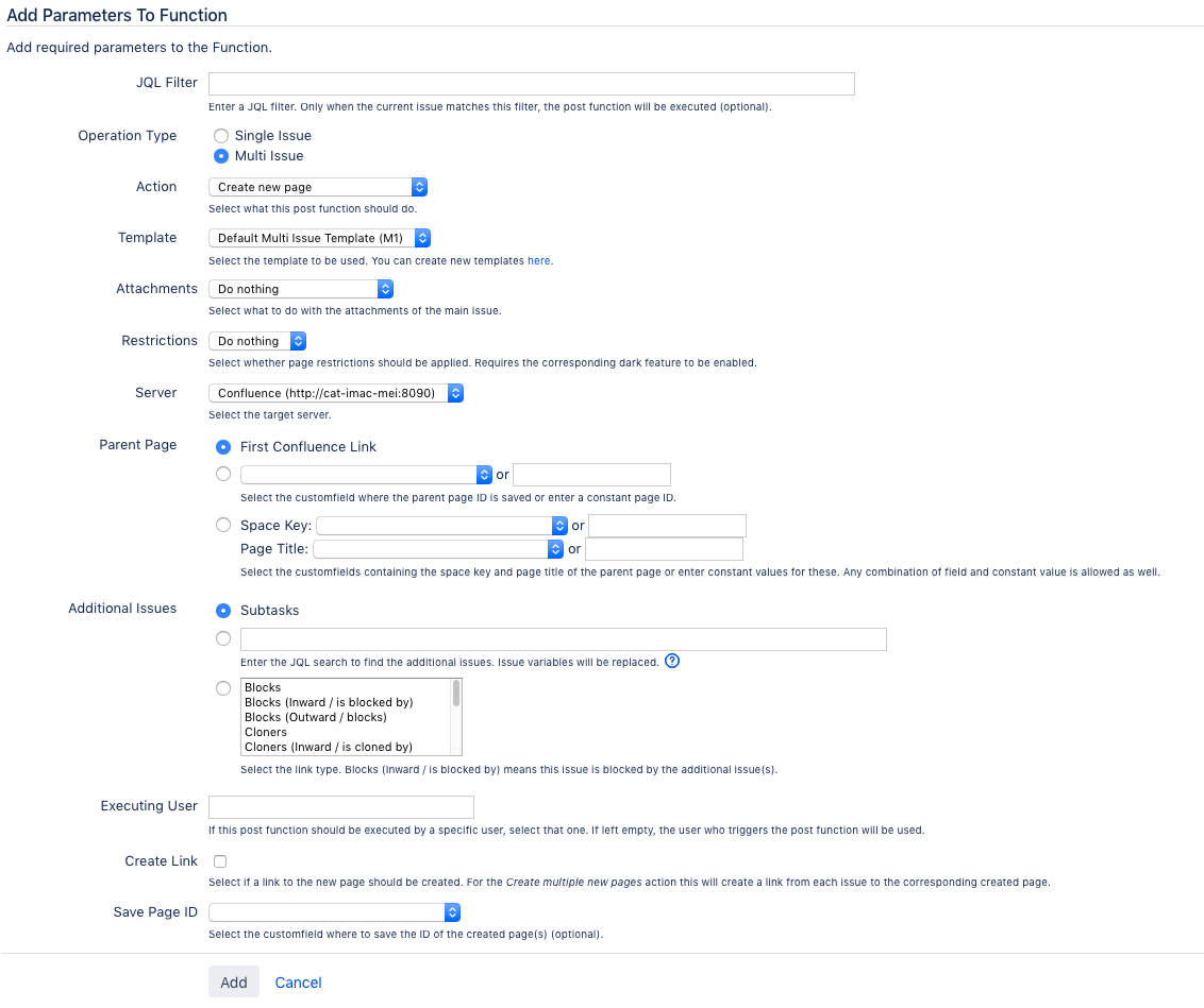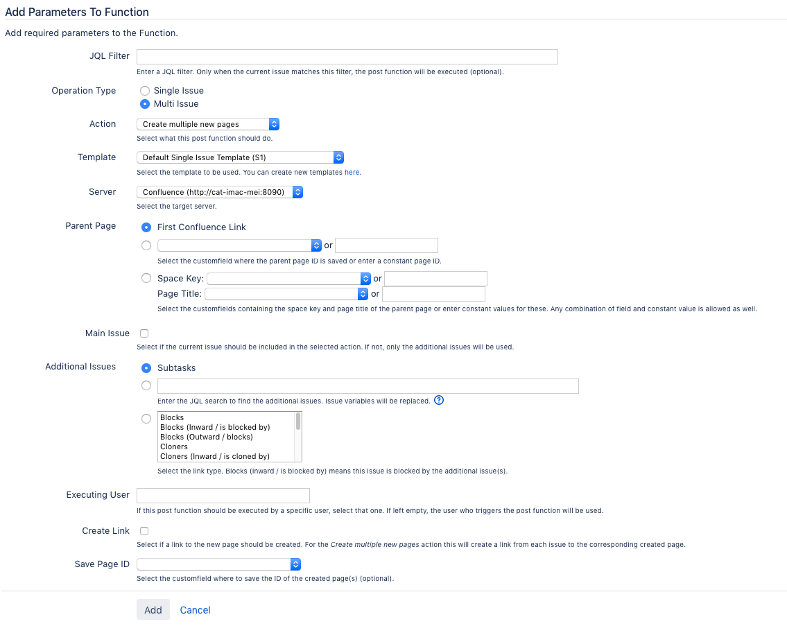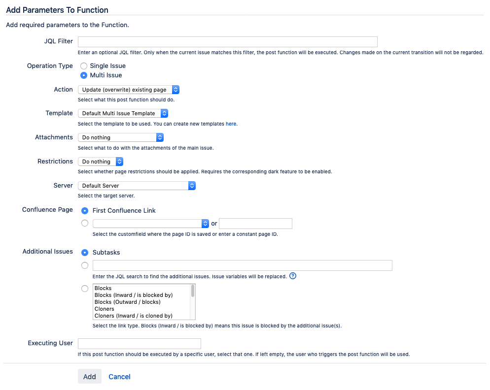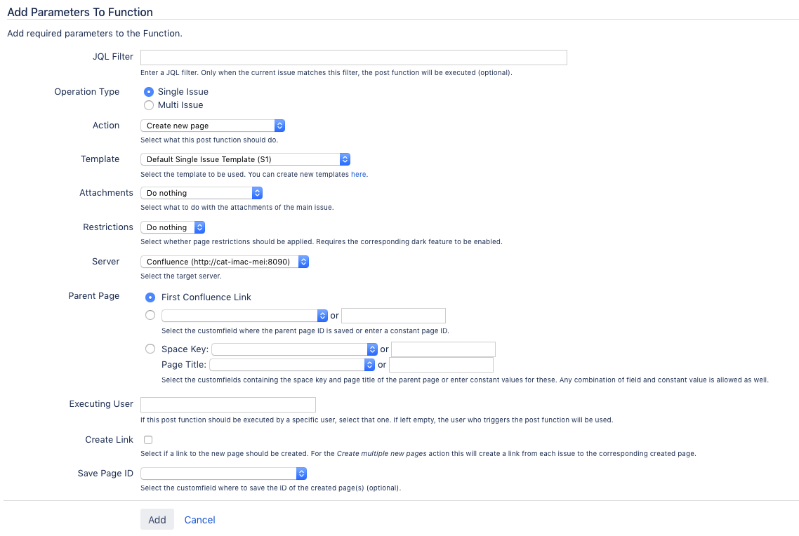 - JQL Filter: Enter a JQL statement. Only if the current issue matches this filter, the post function will be executed (optional).