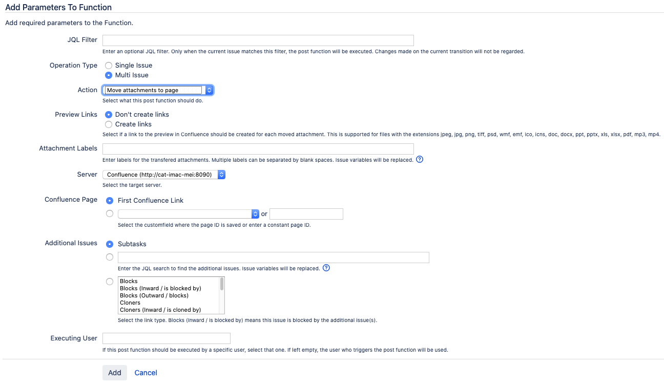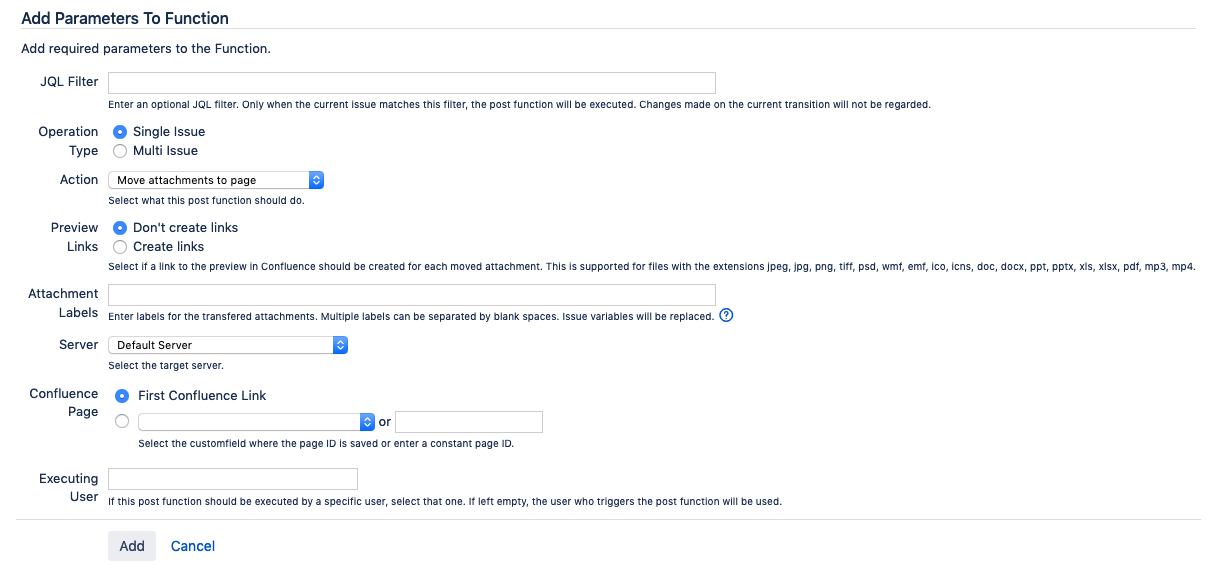 Moves all attachments of the Jira issue to the linked Confluence page.
