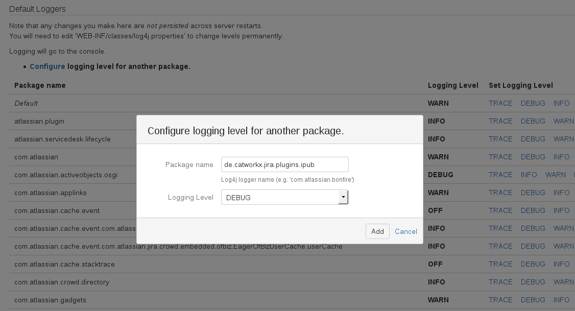 For this go to Logging and profiling again and scroll down. In the Logging and profiling section find de.catworkx.jira.plugins.ipub