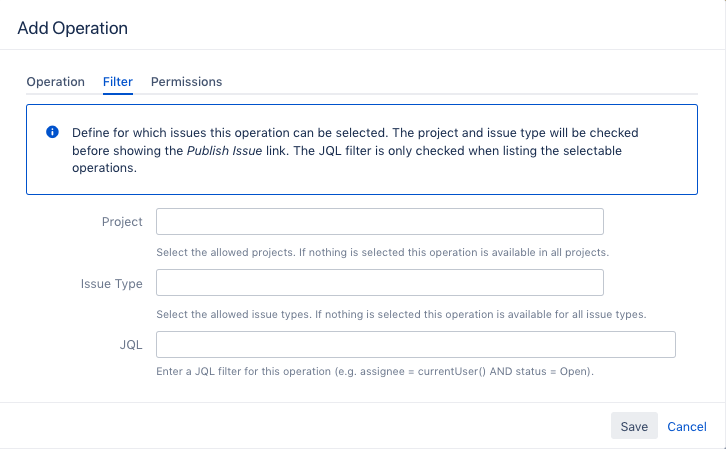 issuetype = Bug AND project = TEST AND status = Open). Only if the current issue matches the filter, the operation can be selected.The JQL filter is only checked when listing the selectable operations.