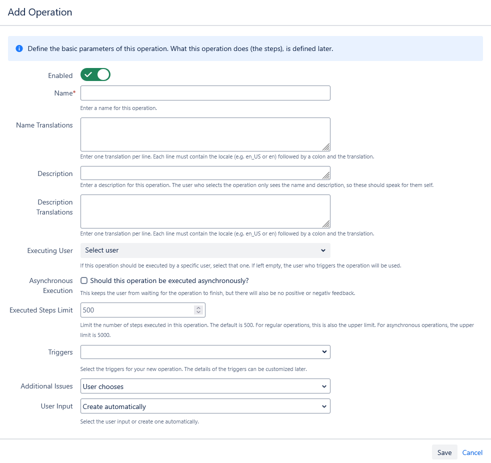 Enter a name and optionally a description for your operation. You can also enter translations for the name and description. These will be shown to users with a matching local/language when selection the operation in the Publish Issue dialog.