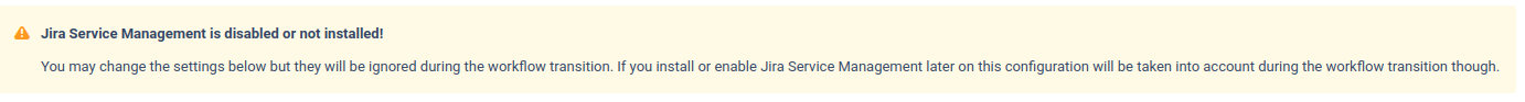 In case Jira Service Management is not installed, not licensed or disabled the box shown on the right will be displayed in the workflow post function during the configuration.