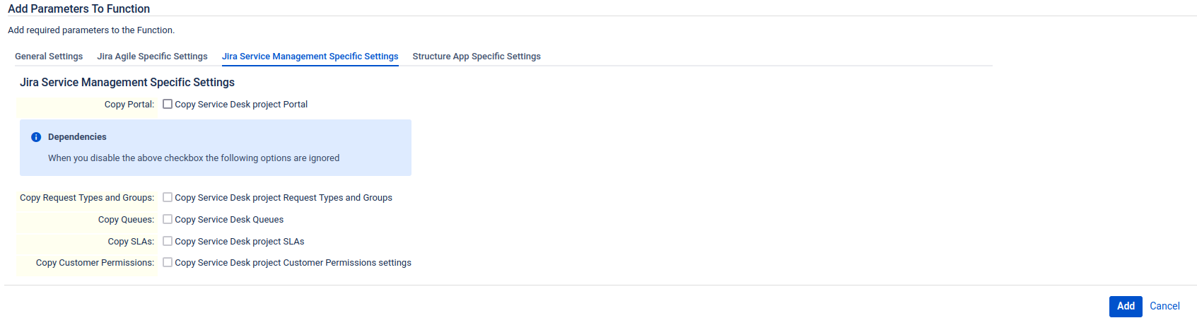 This page contains all Jira Service Management specific settings required to actually copy any portal settings, like e.g. request types, SLAs etc.
