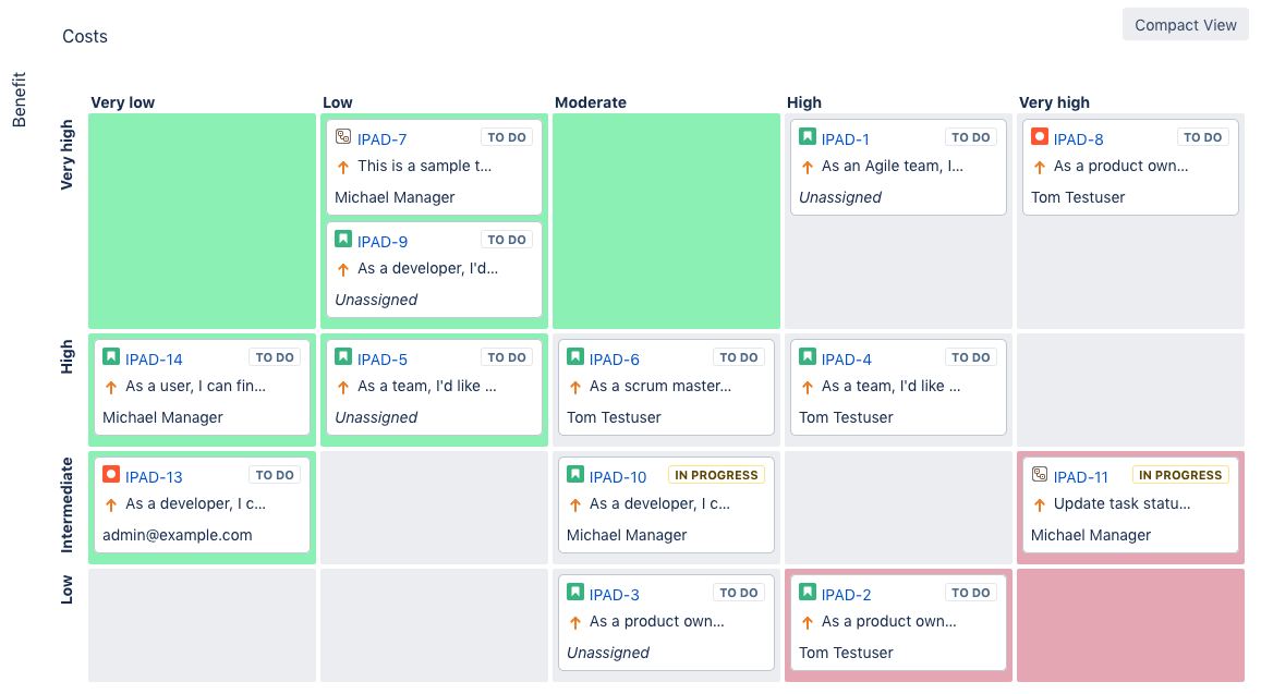 With catworkx Matrix for Jira, you can set up a matrix. Select two custom fields to be represented by the horizontal and vertical axis. The issues are shown as cards inside the matrix (similar to the Jira Software Kanban/Scrum Boards). Matrix for Jira supports drag and drop to move the issue cards inside the matrix. By moving a card, the custom field values of the issue are modified acordingly.