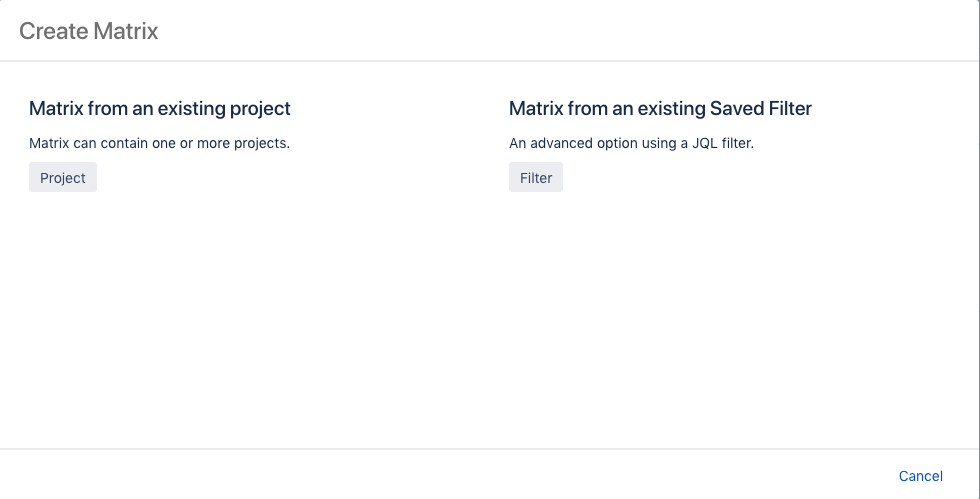 You have to specify the issues that should be displayed in the new matrix. In this dialog, you can select an existing project as source of issues or an existing saved filter: