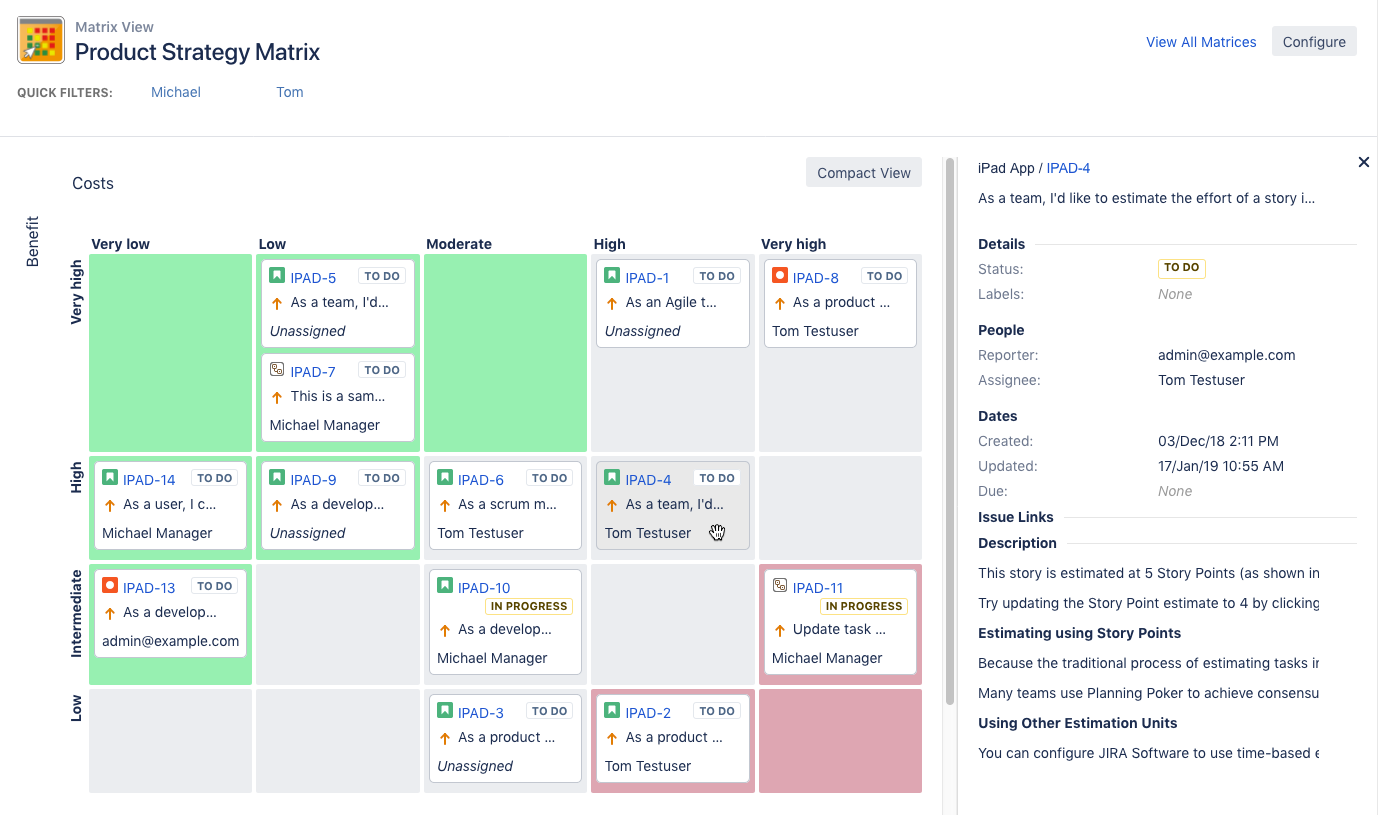 To display issue details, click a card in the matrix. The issue details are displayed in the sidebar on the right.