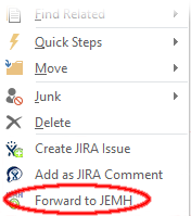 If the Enterprise Mail Handler for Jira (JEMH) add-on is installed on your Jira server and JEMH integration is enabled under Advanced Configuration Settings > JEMH in the Outlook Integration for Jira add-in, you forward an Email to JEMH directly in Microsoft Outlook. Do the following: