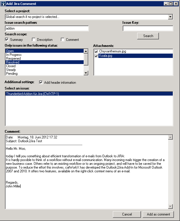 After selecting an issue the comment and the attachments will be added by clicking "Add as comment". In case of success or failure an appropriate message will be shown.