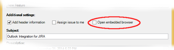 The embedded browser is needed to enter additional information for the selected project and issue type. When all mandatory information is given in the "Create JIRA Issue" dialog, the embedded browser will not open automatically. To force Outlook to open the embedded browser, select this option. Then you can enter e.g. optional information.