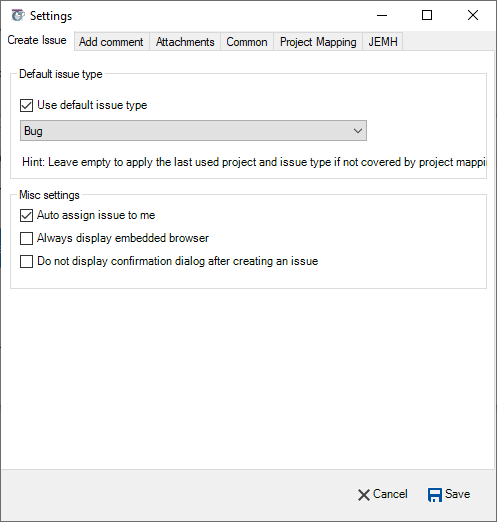 This dialog is used to set defaults for the process of creating a Jira issue out of an email.