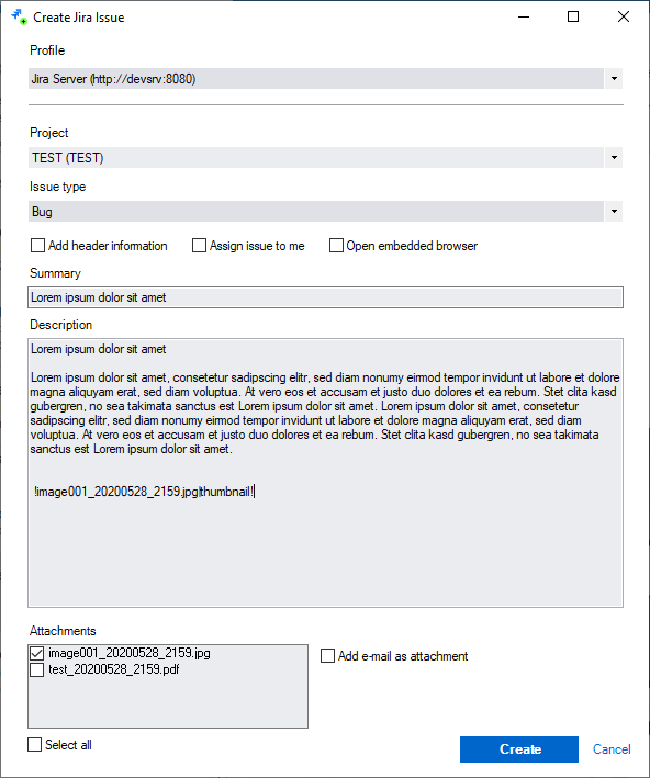 A list of the files that are attached to the email is displayed in the Attachments frame. Select the files, you want to attach to the Jira issue. Use Select All to un/select all attachments. The attachments are uploaded after the issue is created successfully.
