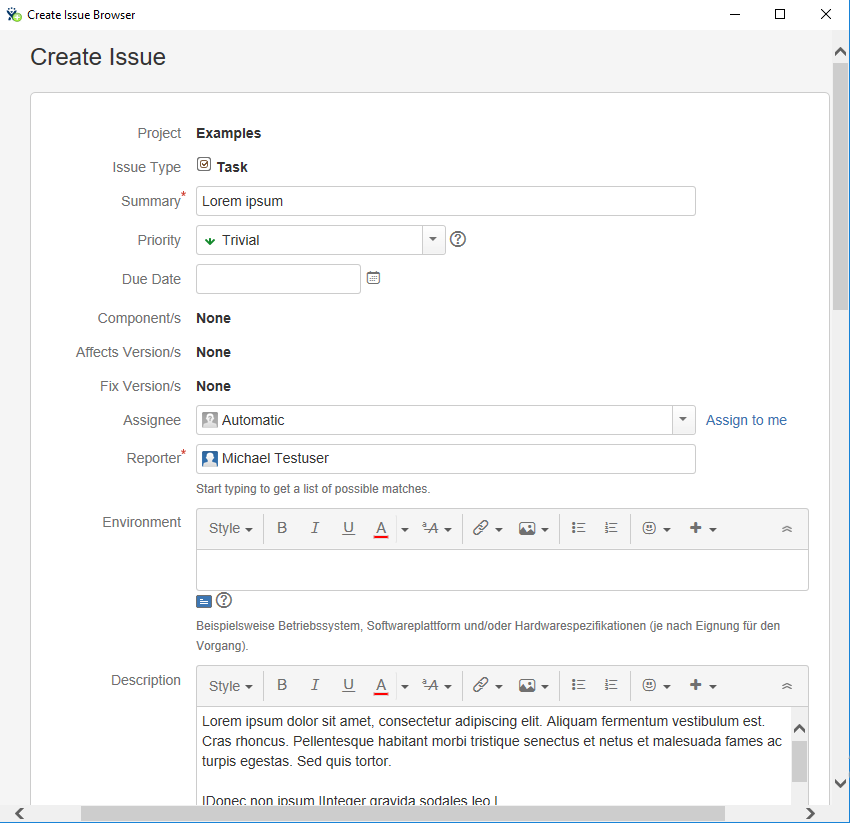 From the Issue type pull-down menu, select the issue type of the new issue. The content of the menu depends on the selected project. By default the last used issue type based on the last used project is selected.