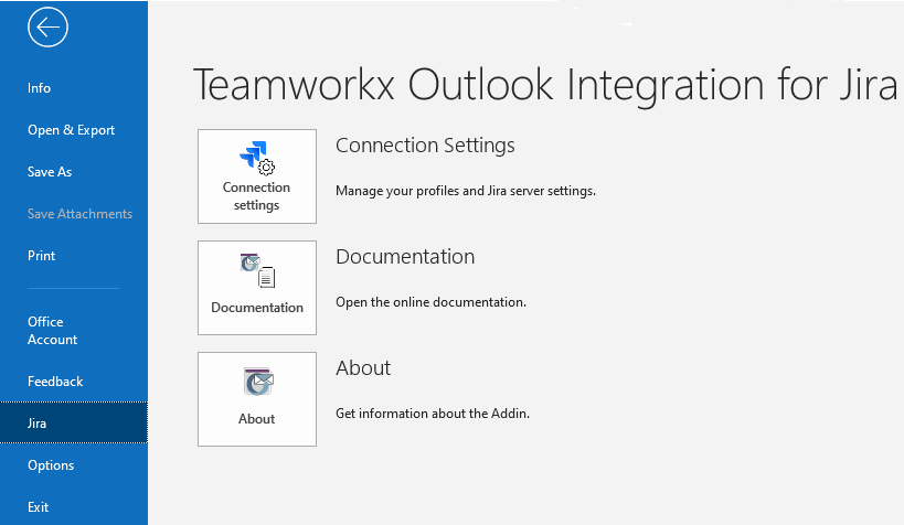After installing Teamworkx Outlook Integration for Jira, a new backstage menu called "Jira" will be added.