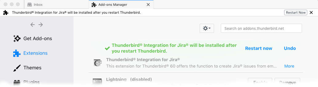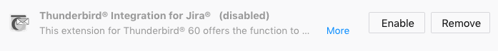After the installation, "Thunderbird Integration for Jira" is displayed at the top of the list of add-ons in the "Add-on Manager".