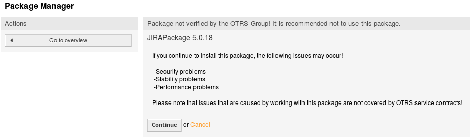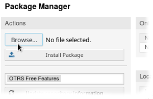 4. In the "Actions" section of the "Package Manager" dialog, browse for the proper OTRS package and click Install Package.