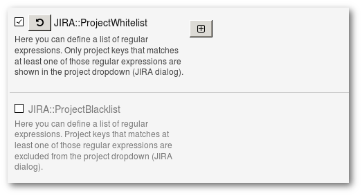 At the bottom of the dialog, you can activate either white-listing or black-listing for projects using regular expressions. For white-listing, only project keys that matches at least one of those regular expressions are shown in the project dropdown (JIRA dialog). For black-listing, only project keys that matches at least one of those regular expressions are excluded from the project drop-down.