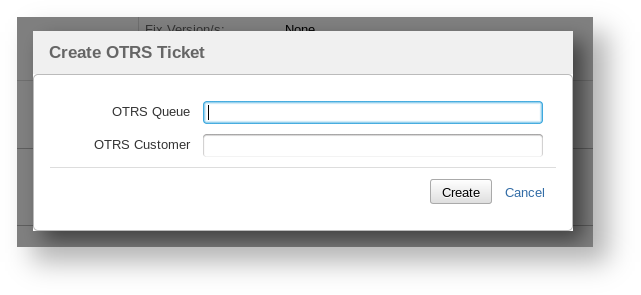 2. Im nun erscheinenden Fenster lassen sich noch der Kunde und die Queue fürs OTRS einstellen. Die Eingabefelder sind, falls vorhanden, vorbelegt mit den Werten aus den entsprechenden Customfields. In der Konfiguration lassen sich diese Felder auch auf nur lesend stellen.