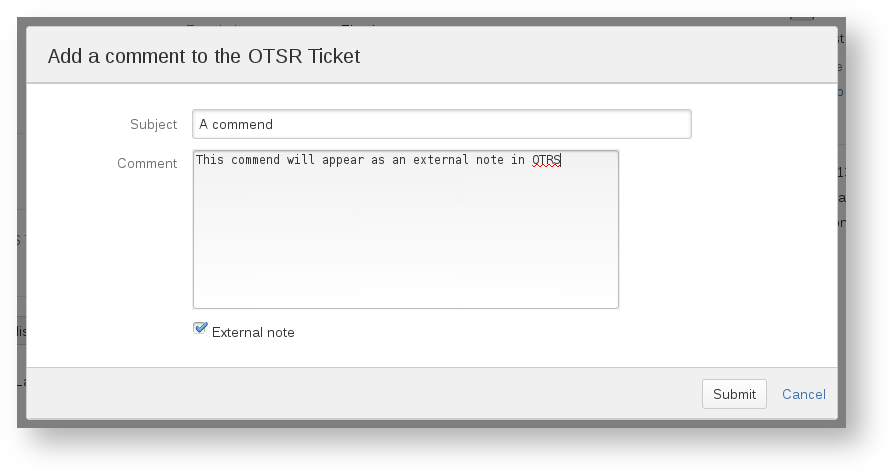 2. Im nun erscheinenden Fenster lassen sich Betreff/Subject und Kommentar selber eingeben. Solange kein Betreff eingegeben wurde lässt sich der Kommentar jedoch nicht übermitteln. Mit einer Checkbox wird er zu einer externen Notiz im OTRS, die auch von Kunden gesehen werden kann. Der Kommentar wird auch dem JIRA Issue angefügt.