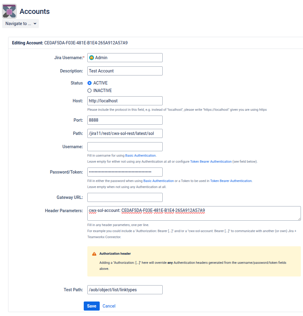 - Test Path: (optional) A path to test the connection to the client host (GET only). In case of a Jira to Jira connection use "